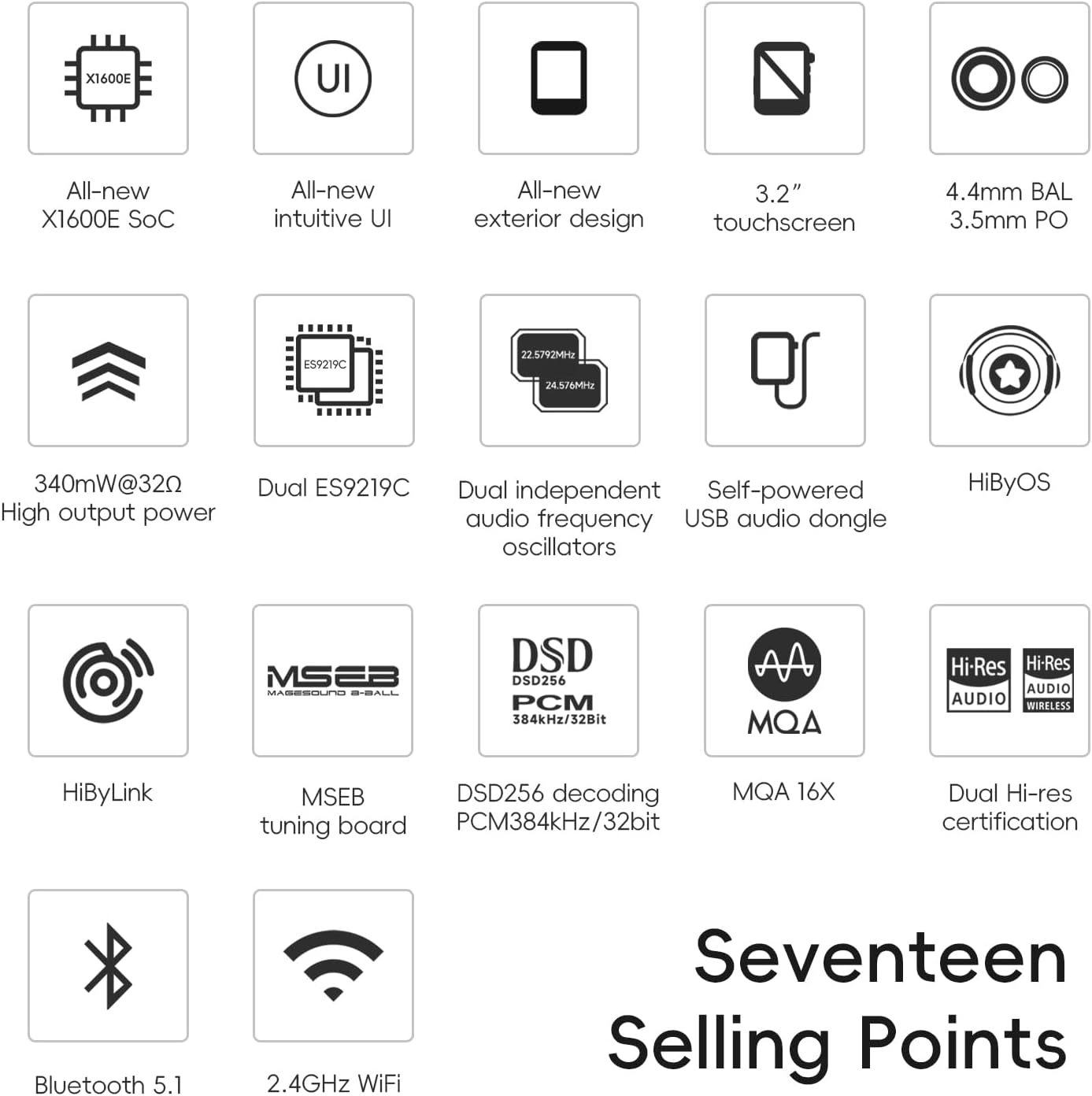 | Additional Features | Bluetooth5.1 and Wi-Fi, DSD 256native,PCM 384kHz/32bit,MQA 16X, Hi-Res Audio, PO 3.5mm + BAL 4.4mm port output, Tidal and Qobuz |